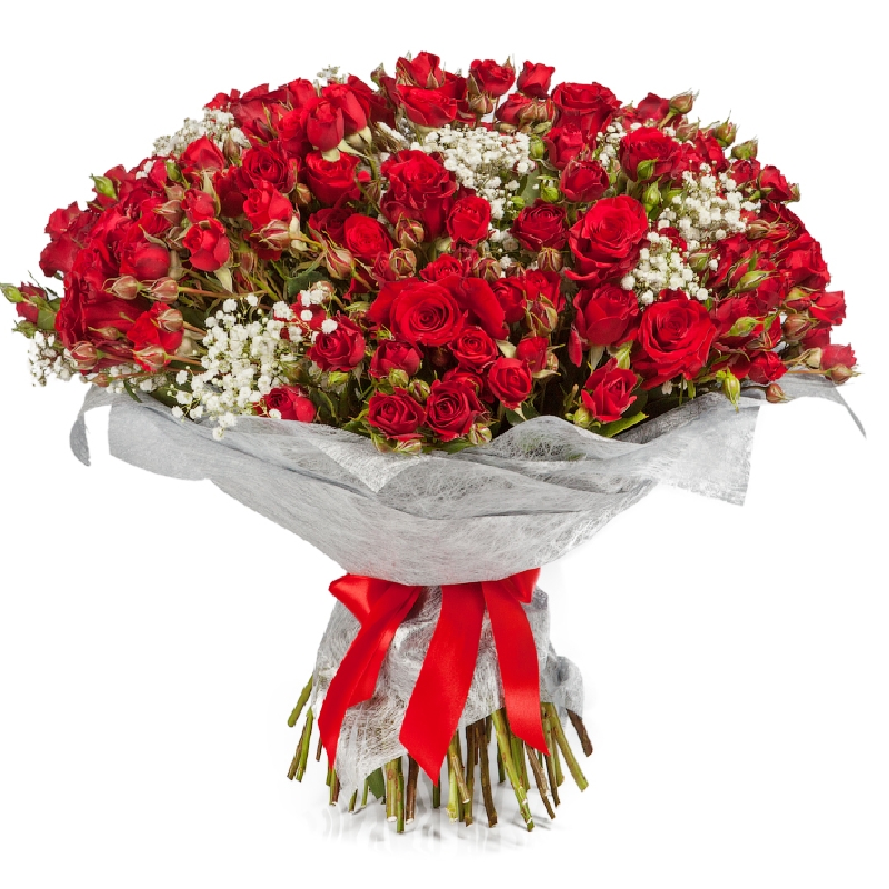 Букет состоит из 51 красная кустовая роза, 10 веток гипсофилы, сизаль, атласная лента.