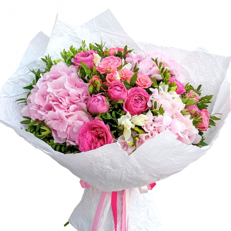 Букет состоит из 3 розовые гортензии, 5 веток пионовидных роз, зелень, упаковка, атласная лента.
