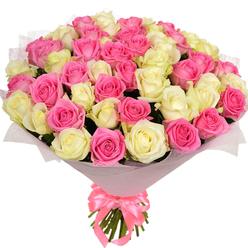 Букет состоит из 26 белых роз, 25 розовых роз, красивая упаковка, атласная лента.