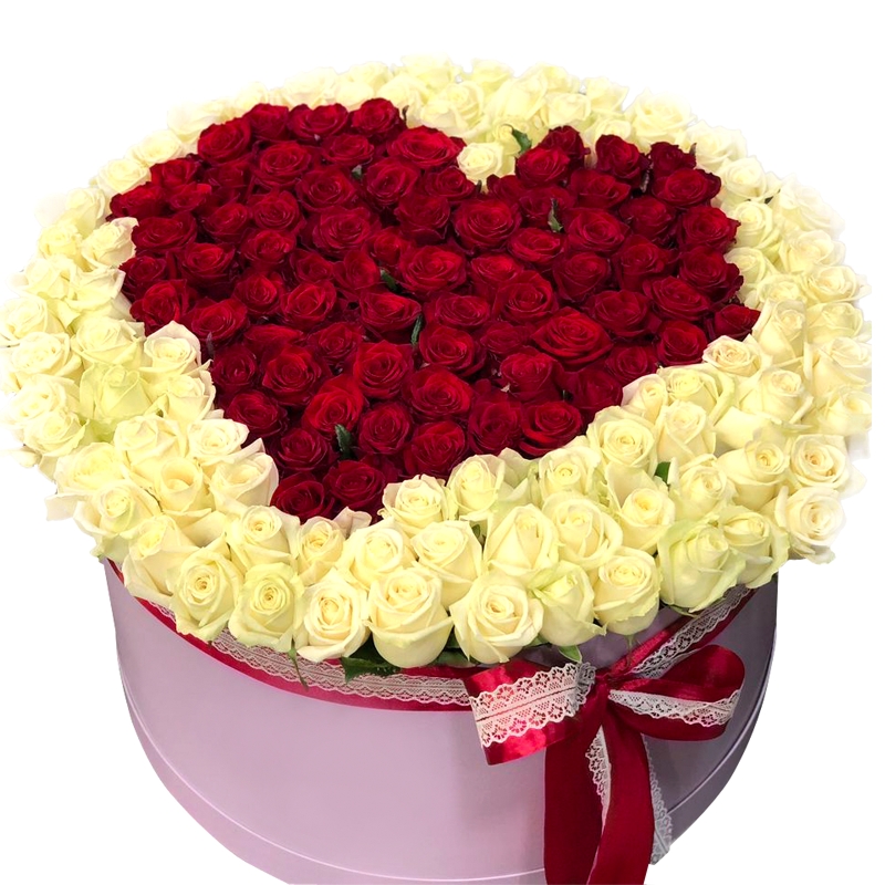 Сердце из 101 красной и белой розы в коробке