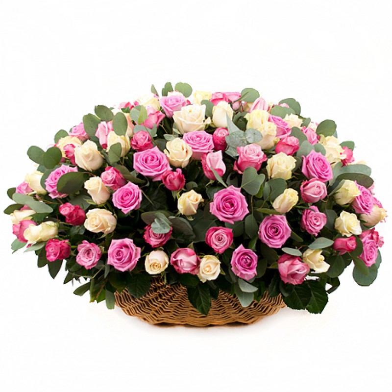 Букет состоит из 50 белых роз, 51 розовая роза, зелень, корзина.