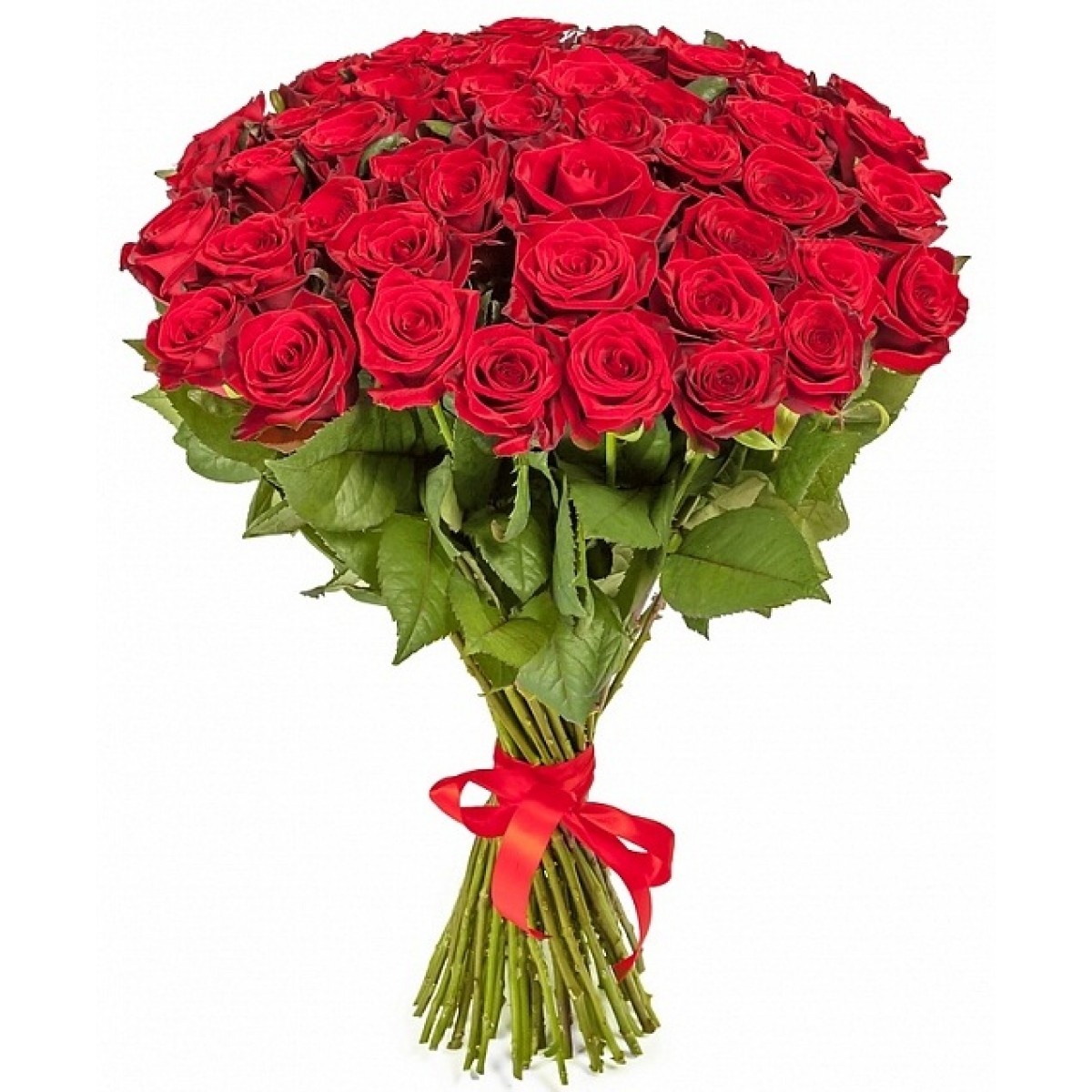 Букет состоит из 55 красных роз, прозрачная упаковка, атласная лента.